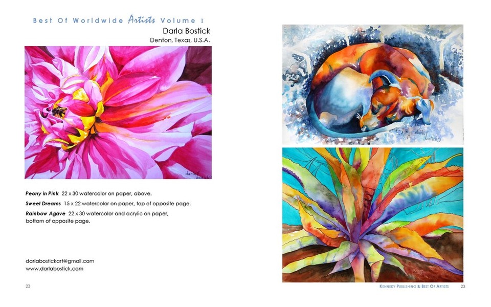 "Best of Worldwide Artists, Volume I" by Kennedy Publishing, 2 page spread includes 3 watercolor paintings