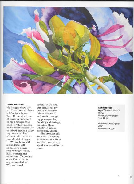 Darla regularly participates in solo exhibits for watercolor, mixed media and photography throughout the North Texas area and her art work has appeared in several publications, web pages and television. She has been published in “Art Educator”, "Zentangle 9", "Best of America Watercolor Artists & Artisans, Vol. I", “Art Folio 2020,A Curated Collection of the World’s Most Exciting Artists, Vol 1, ”on the covers of “Denton Connection” and “Denton Scramble” magazines and work has been chosen numerous times for calendars by Visual Arts Society of Texas and Irving Art Association. Each year she publishes a calendar of her own that shares her paintings. Her major emphasis is color, line and texture. Her work currently hangs in private collections worldwide. Darla's work has been included in juried national and international exhibitions in TX, CA, LA, NM, OK, AR, KS, NC, AZ, MN, RI, NC, FL, MS, PA, AK and Canada with some awards along the way!